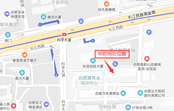 | 1.标的坐落位置:合肥市高新区科学大道122号(东边)房屋。 2.标的权属情况:租赁标的有房地产权证、国有土地使用证,均为大证。标的面积为委托方估算面积,具体使用面积须由承租人自行踏勘了解。租赁标的无权属纠纷,委托方将提供该处标的的权属证明和租赁证明,方便承租人办理相关证照。 3.标的内遗留物品由承租人自行自费处理。 |